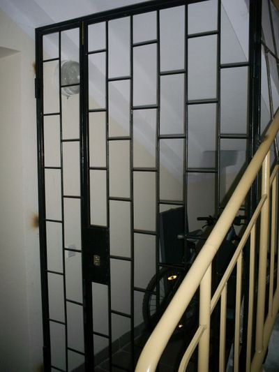 Решетчатая тамбурная дверь на лестничную площадку или в частный дом, отделка на выбор заказчика. Тамбурные двери на лестничной площадке дополнительно защищают от ограбления, а также изолируют помещения от холодного воздуха и наружных запахов. Эти конструкции дешевле обычных входных изделий, и к тому же с ними можно использовать «карман» для прихожей, кладовки или места хранения велосипедов и колясок.