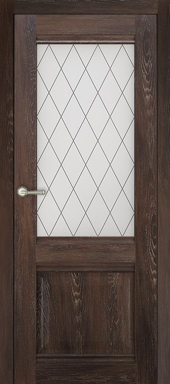 Царговые (сборные) двери изготавливаются в глухом и остекленном варианте в пленке с текстурой под натуральный шпон. В остекленной двери используется матовое стекло (сатинат) с витражным рисунком. Двери комплектуются телескопическим погонажом.